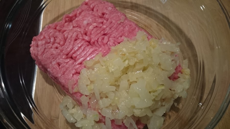 En un bol vertemos la carne picada y añadimos la cebolla sofrita de antes y los tallos picados de la col. Mezclamos bien.