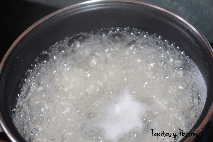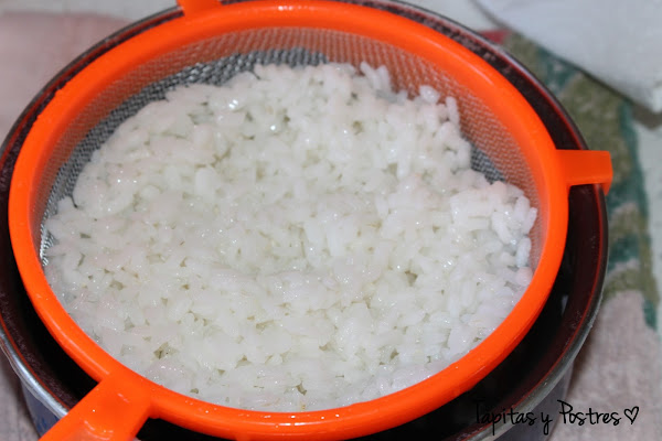 Ahora ponemos agua con sal en un cazo y cuando arranque a hervir añadimos el arroz, lo tenemos cociendo unos 15 minutos. Lo pasamos por agua fría para cortar la cocción y dejamos escurriendo.