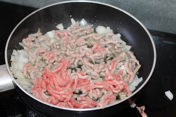 Seguimos con el relleno. Pochamos la cebolla con la carne, salpimentamos y dejamos enfriar.