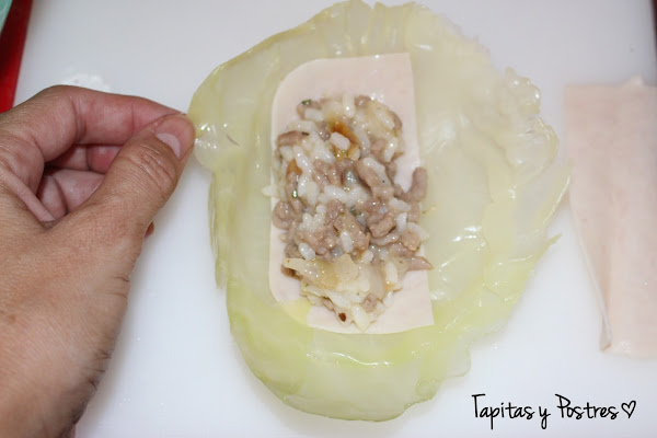 Cogemos cada hoja de col, cortamos la parte dura del extremo y colocamos media loncha de jamón cocido, encima ponemos una cucharada del relleno y cerramos con cuidado.