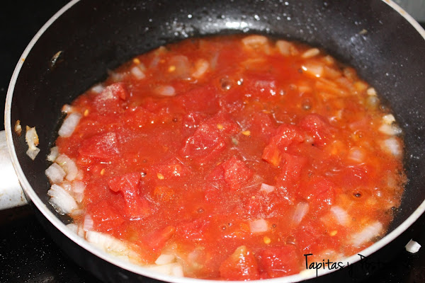 Mientras se hornean, preparamos la salsa. Pochamos la media cebolla picadita en una sartén con aceite. Cuando esté lista, añadimos el tomate triturado y dejamos que reduzca un poco. Salpimentamos y añadimos la salsa picante al gusto. Podemos dejarla así o triturarla un poco.