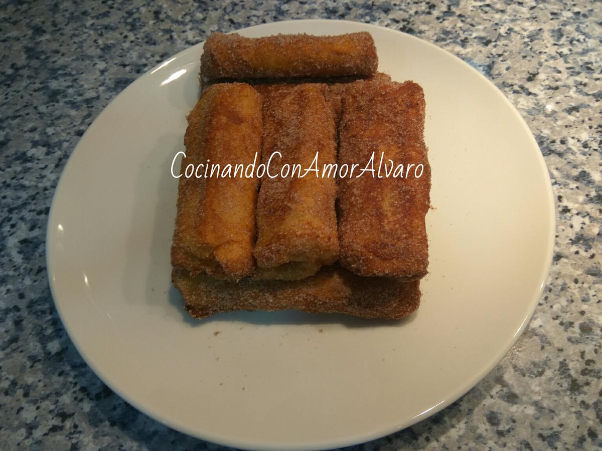 Vamos a preparar hoy unos rollitos, que los elaboraremos con pan de molde. Este pan debe ser sin corteza, lo estiraremos con un rodillo. Después lo rellenamos de dulce de leche, y lo rebozamos en huevo y leche.