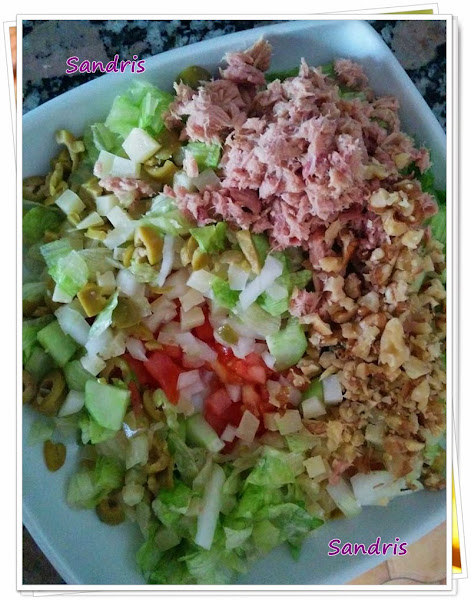 Esta vez nos apetecía algo fresquito y que no se tuviera que cocinar y qué mejor que una ensalada con un toque picantito de la salsa brava (a mi estilo, claro está jejejeje)!!! Así que junté unos cuantos ingredientes y este es el resultado: