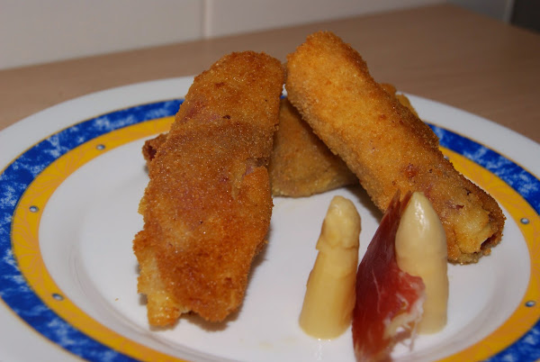 Hacemos tiras de queso fundido con el mismo grosor que los espárragos, y colocamos una tira en cada uno de los espárragos, cubriendo con la otra mitad haciendo una especie de bocadillo.