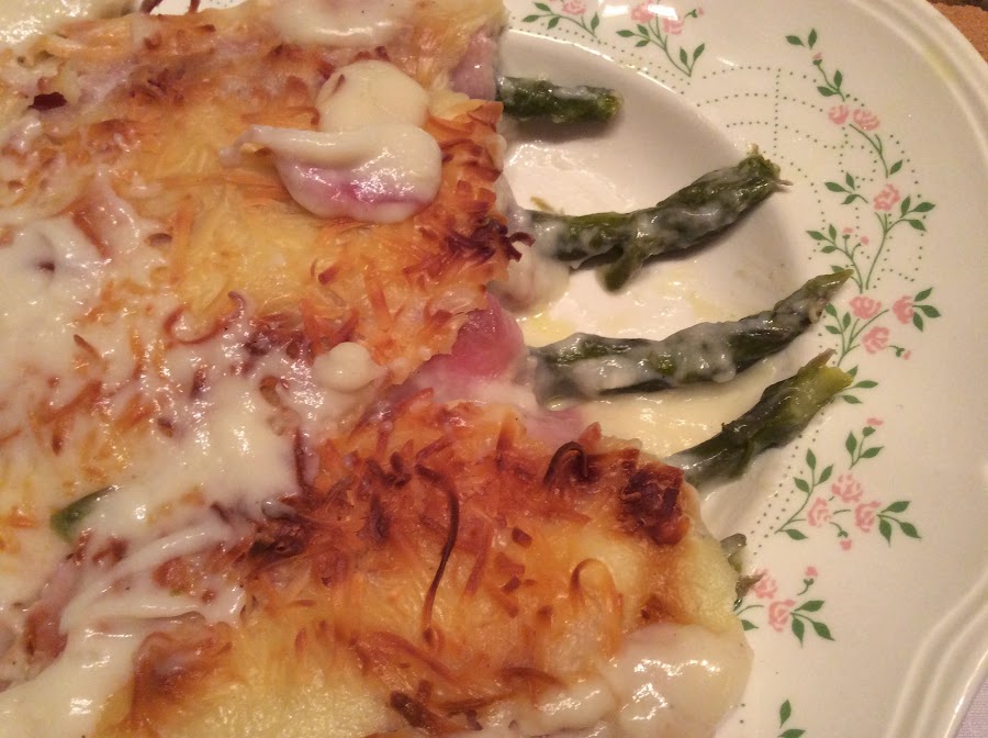 Sobre una parte lisa, colocamos una loncha de jamón York, sobre ella una loncha de queso y por último el espárrago. Enrollamos y vamos colocando sobre una bandeja apta para horno.