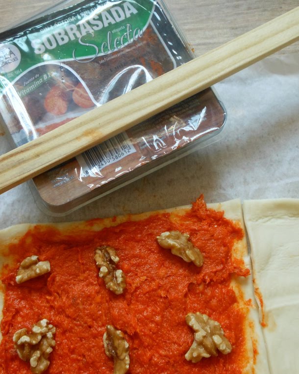 Después unta una de las partes con sobrasada y añádele las nueces mondadas.