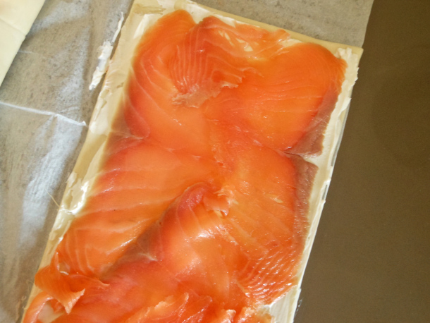 Unta la otra parte con queso crema y dispón encima las lonchas de salmón ahumado.
