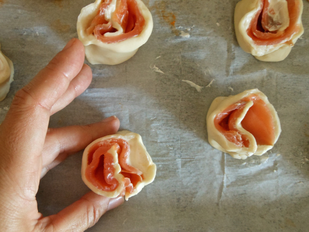Seguidamente coloca el papel sulfurizado cubriendo la placa de horno, dispón los rollitos de pie y dale forma con los dedos.