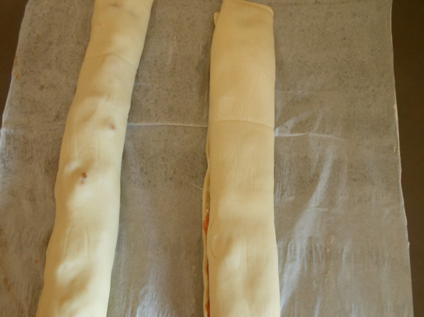 Luego, enrolla cada parte de masa por su parte más larga.