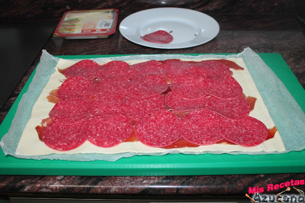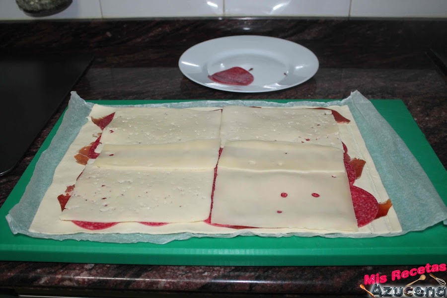 Ahora extenderemos la lámina de hojaldre y ponemos las lonchas de jamón serrano, no llegaremos a los filos de la masa de hojaldre.