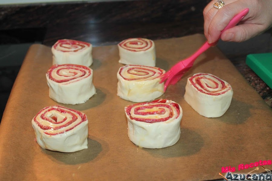 Cogemos el huevo y en un cuenco pequeño lo batimos y pintaremos todas las porciones que acabamos de hacer, cuando las tengamos todas pintadas las pondremos sobre el papel que traía la masa en la bandeja del horno, introducimos y dejamos cocer entre 15 y 20 minutos.