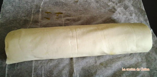 lo enrollamos como si fuese un brazo gitano, pintamos bien las orillas de huevo batido para que se pegue y le damos una capa con el mismo huevo batido por encima.