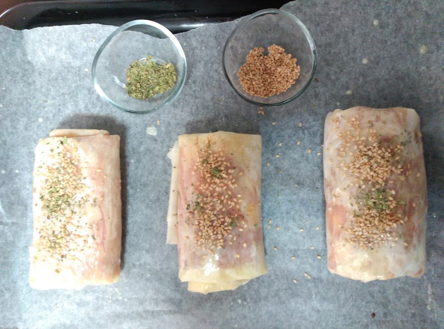 Enrolla sobre si mismo y ponlo en la bandeja del horno sobre un papel sulfirizado. Pincela con mantequilla y espolvorea con orégano y sésamo.