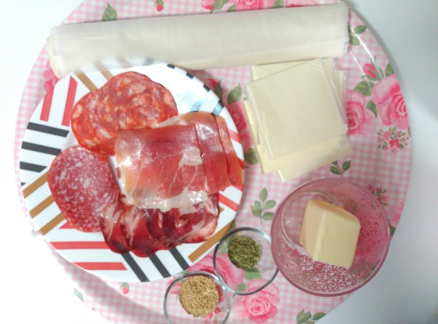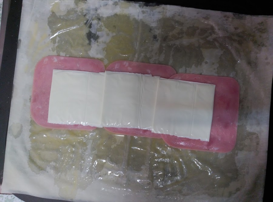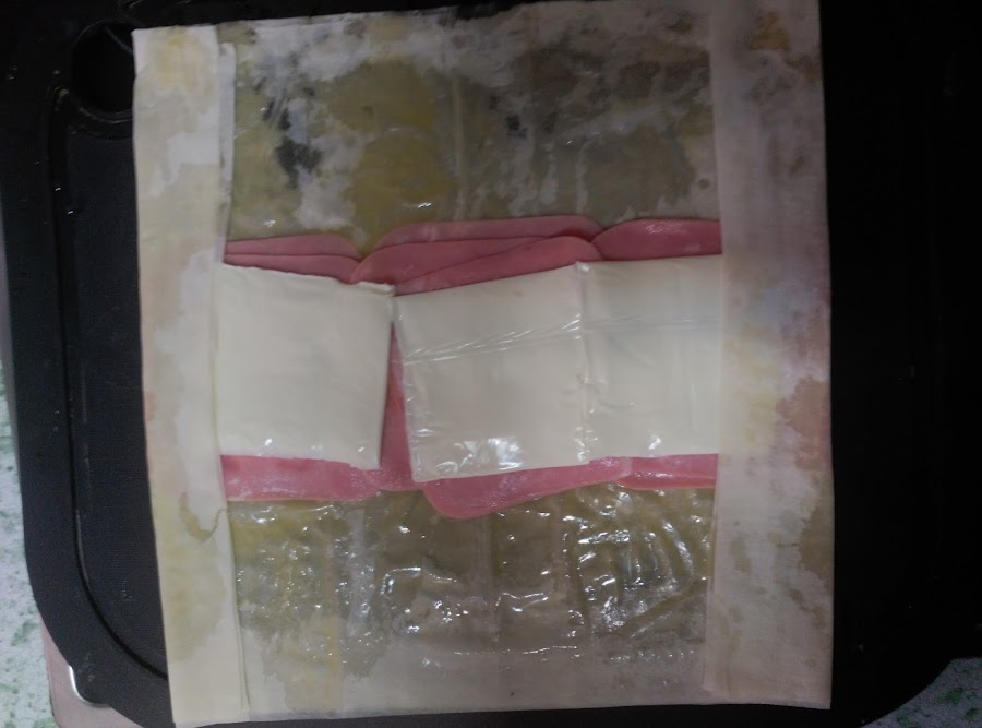 Dispón encima una fila de jamón o embutido y otra de queso. Ponlo centrado y deja un espacio arriba y abajo