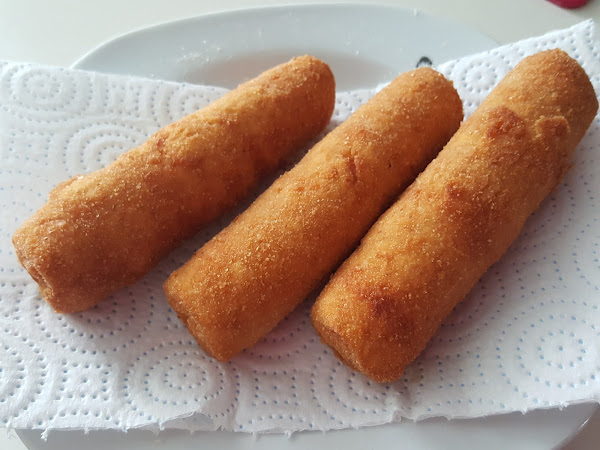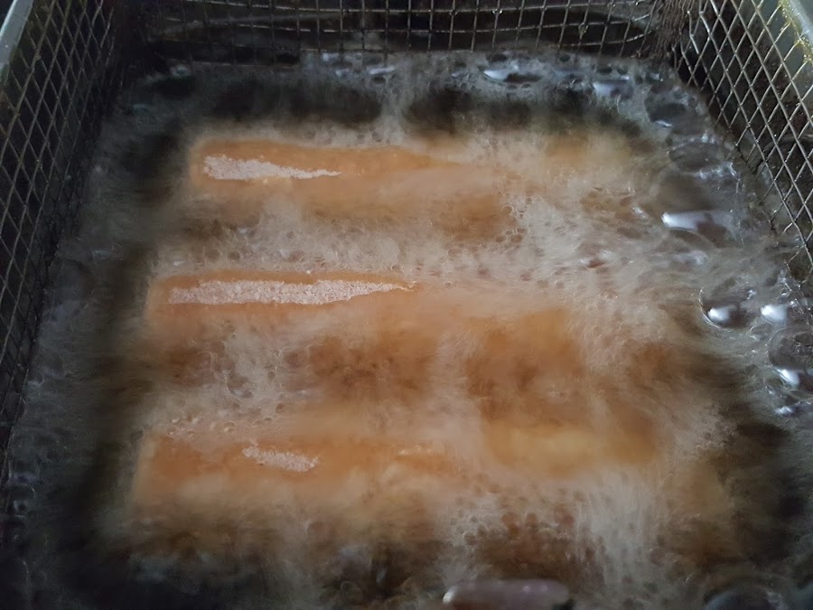 9. - Y freímos en abundante aceite caliente, a fuego medio, para que se derrita bien el queso.