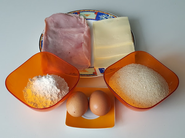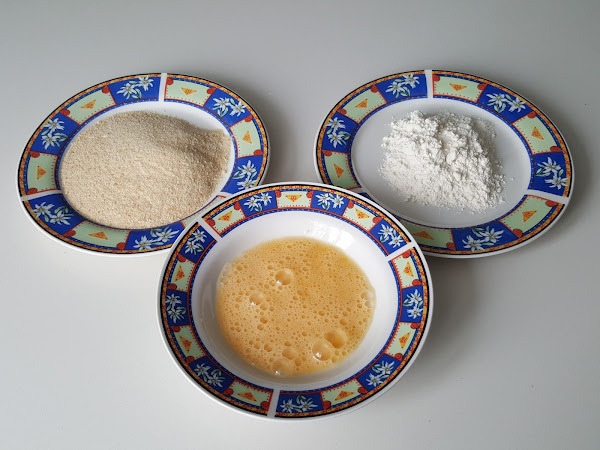 1. - Primero dispondremos los tres ingredientes para el empanado en 3 platos: uno con harina, otro con huevo batido y otro con pan rallado.