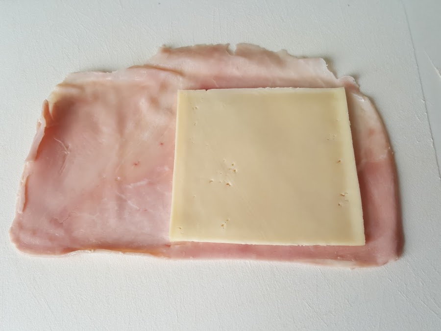 3. - Ponemos una loncha de gouda en uno de los lados, si es necesario, recortamos el jamón al ancho del queso, dejando un dedo por cada lado.