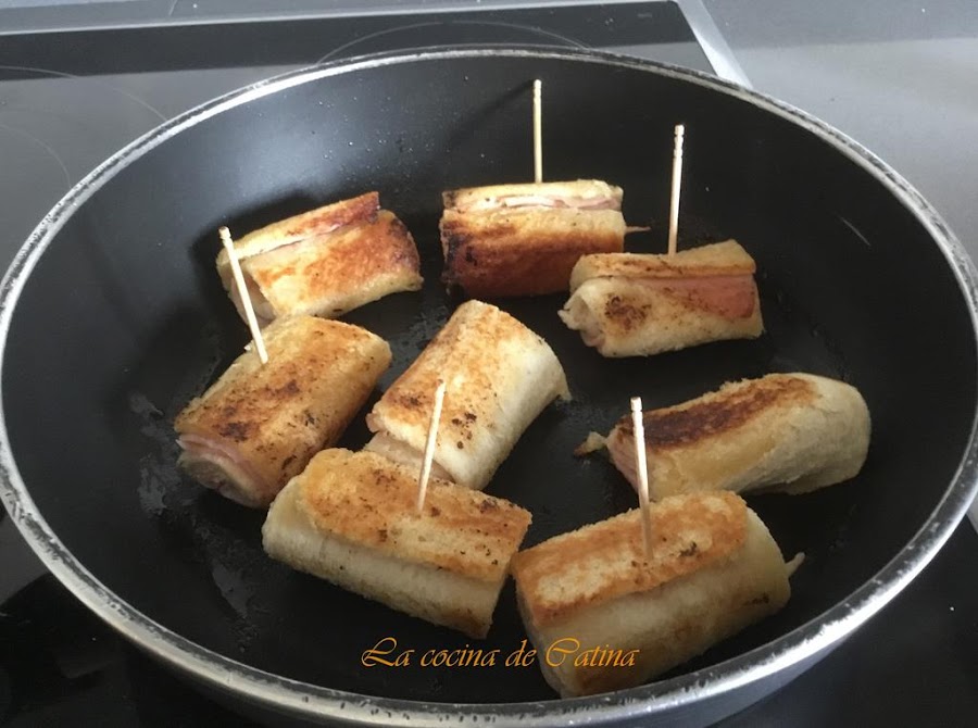 Cortamos las rebanadas en sentido longitudinal por la mitad y después enrollamos cada parte sujetándola con un palillo.