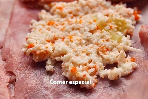 ELABORACIÓN: triturar los palitos de surimi y mezclar con trozos de piña según apetencia, además de un poco de mahonesa, muy poco. Rellenar las lonchas de jamón con la crema de surimi que acabamos de preparar. Enrollar con cuidado y acompañar, si se quiere, de ensalada al gusto.