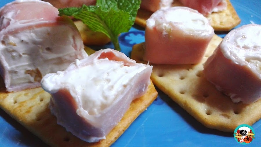 1.- Batimos el queso hasta que adquiera una textura de cremosa. Picamos las nueces y añadimos un poco de pimienta molida. Extendemos el queso sobre las lonchas de jamón. Los enrollamos, apretando un poco. Reservamos 1 hora en la nevera, cubiertos por papel film. Pasado ese tiempo, cortamos en rodajas gruesas. Servimos enseguida sobre las galletas saladas.