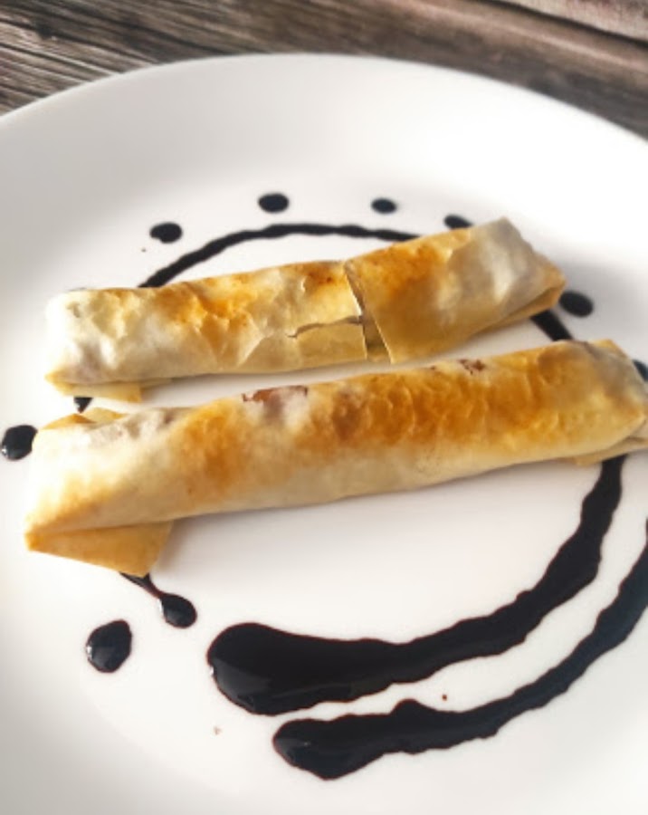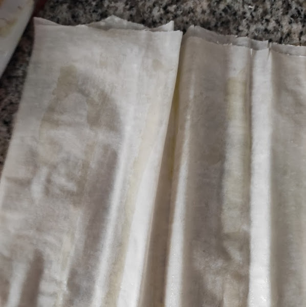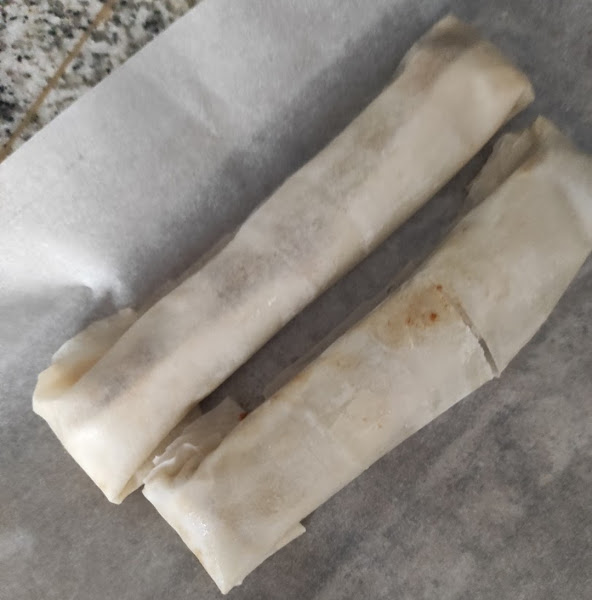 Pintamos con aceite de oliva las hojas de pasta filo, necesitamos que sean dobles para los rollitos. Las cortamos del tamaño deseado para los rollitos.