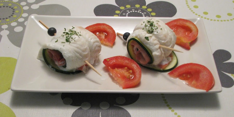 - Estirar los filetes de lenguado y colocar encima de cada uno una loncha de calabacín y otra de jamón serrano.