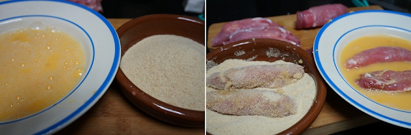 Ponemos el pan rallado en un bol y en un plato batimos un par de huevos. Pasamos los rollos primero por el huevo y luego pasamos los rollitos por el pan rallado.