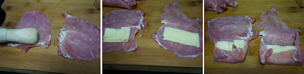 Empezaremos preparando el lomo. Salamos un poco el lomo, aplanamos los filetes de lomo un poco con un mazo, ponemos las lonchas de queso en el borde del lomo y enrollamos los filetes.