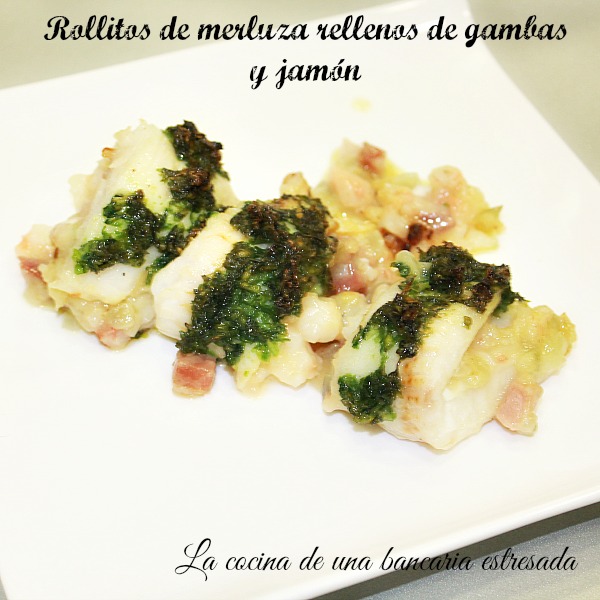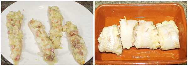 Cuando el relleno este frío lo repartiremos por encima de cada uno de nuestros filetes de merluza y, con mucho cuidado, los enrollaremos. los fijamos con un palillo atravesándolo para que no se nos deshagan en el horno.