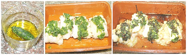 En un vaso ponemos un poco de aceite y la picada de ajo y perejil y mezclamos bien. Se lo echaremos por encima a la merluza.