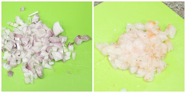 En primer lugar partiremos la cebolla y las gambas pequeñitas, lo más que podáis (no las paséis por la picadora, cambia mucho la textura y también el sabor), y reservamos.