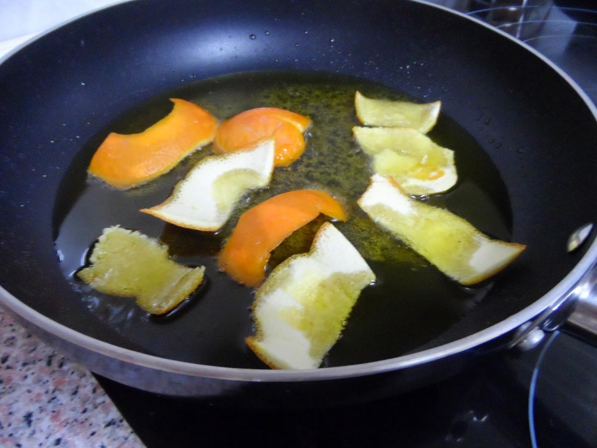 primero freimos en el aceite unas pieles de naranja