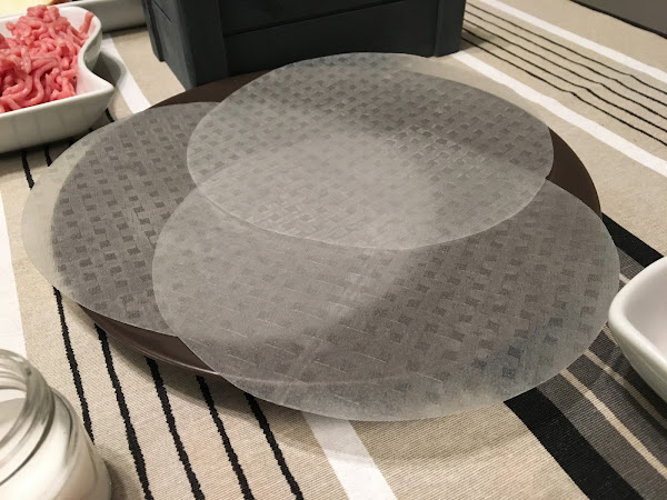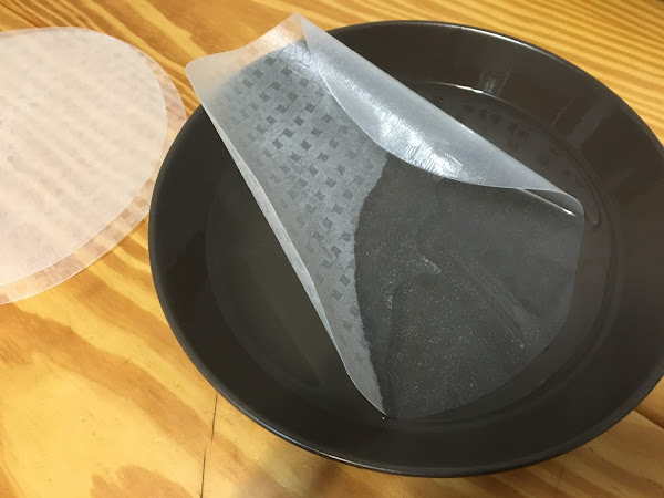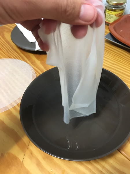 Ponemos las obleas de arroz en agua templada para que se ablanden y sean manejables. Os recomiendo que lo hagais de una en una y vayas rellenando una a una. La primera a lo mejor os va costar un poquito, pero cuando cojais práctica ya vereis lo rápido que lo haceis.