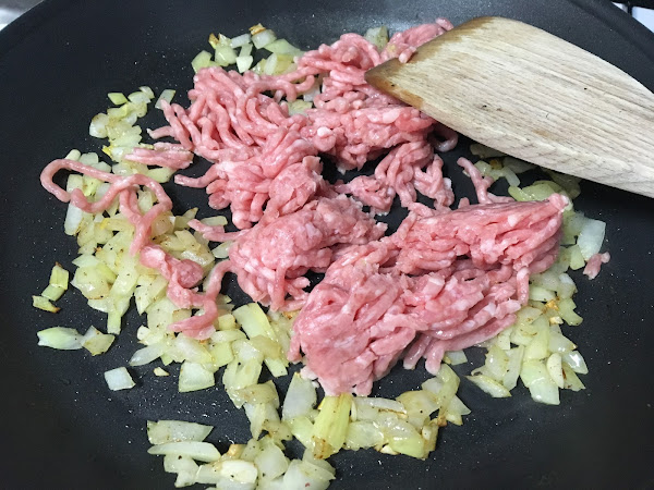 Picamos media cebolla y un ajo. Ponemos una sartén con aceite al fuego y ponemos la cebolla y el ajo picado. Lo salpimentamos y cuando se estén empezando a dorar le añadimos la carne picada y un chorro de Lea & Perrins.