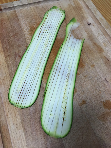 Cortamos dos "lonchas" de calabacín con una mandolina y los cortamos a tiras.
