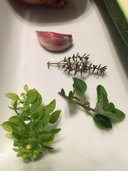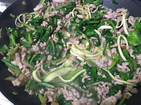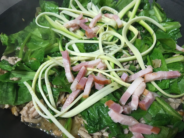 Añadimos las tiras de calabacín, el bacon, las hojas de la ramita de tomillo y las hojas de la ramita de mejorana y lo vamos removiendo hasta que las hojas de acelga hayan reducido, momento en que pararemos el fuego.