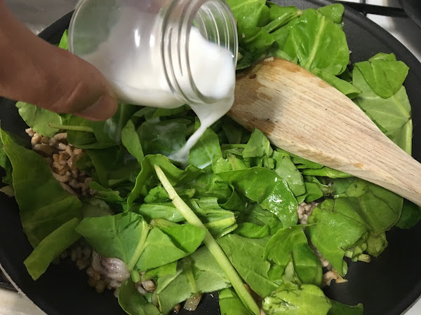 Cuando veamos que la carne ya ha cogido color le introducimos las acelgas y la leche de almendras y removemos.