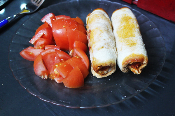 Servir dos rollitos en cada plato acompañando los tomates troceados.