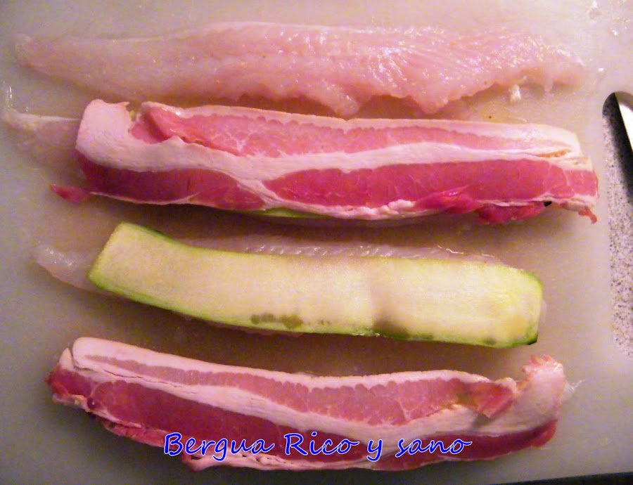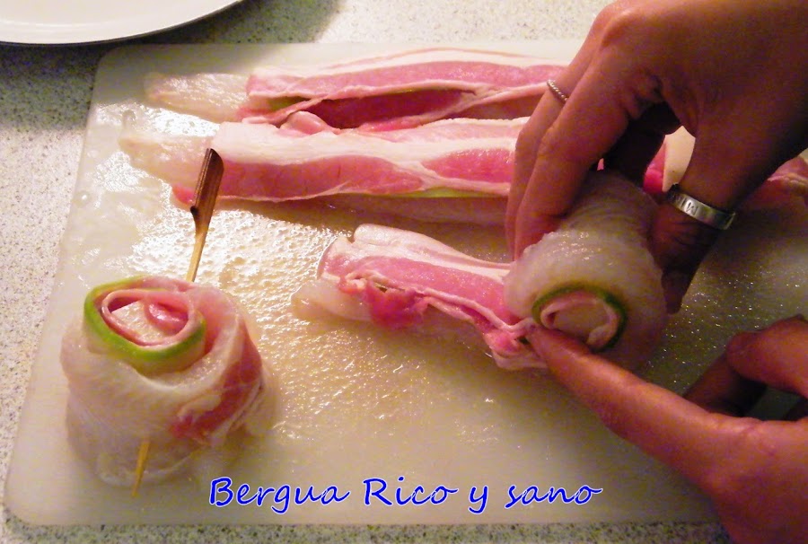 3. Sobre el calabacín extendemos una loncha de bacon y en un extremo colocamos en taco alargado de queso.