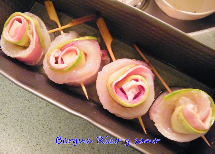 2. Con un pelador de verduras o de patatas, sacamos 4 lonchas largas de un calabacín. Colocamos cada loncha sobre una mitad de filete.