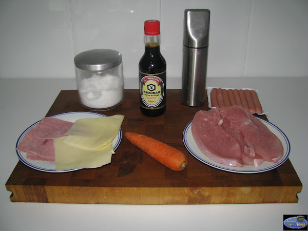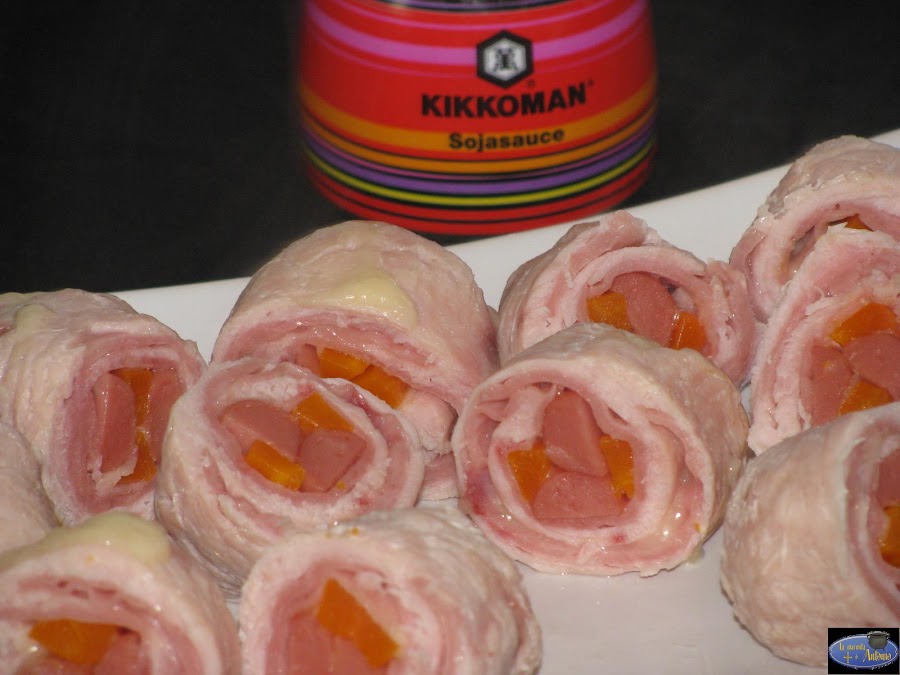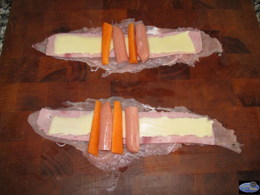 Cortamos unos filetes finos de pavo y los extendemos sobre la tabla.Salpimentamos un poco nada más por que luego los vamos a untar con la soja.Rellenamos con salchicha,queso en lonchas,jamón de york y unos bastones de zanahoria.