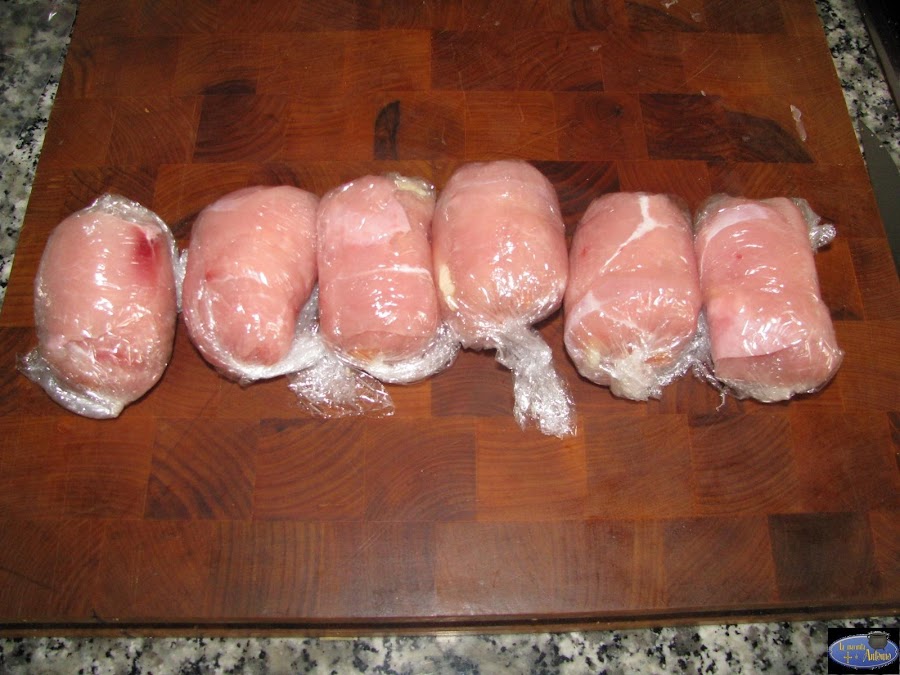 Enrollamos sobre sí mismo y cerramos con papel de plástico.A continuación ponemos agua a hervir y cocemos los rollitos unos 7-8 minutos.