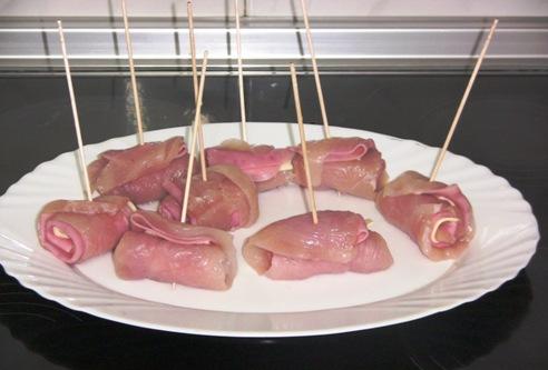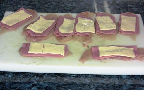 Tal y como se puede ver en las fotos este plato es muy sencillo de hacer, le pedís al carnicero que os haga unos filetes muy finos de pechuga, los sazonamos, le ponemos el jamón york, el queso y los enrollamos.