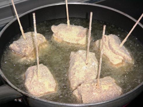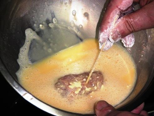 Pinchamos los rollitos con una brocheta corta para que no se abran y los untamos en harina, huevo y pan rallado, cuando el aceite está a temperatura ponemos los rollitos y cuando se haya sellado la parte de la unión de la carne quitamos el palillo para que podamos darle la vuelta y freírlo bien por todas partes.