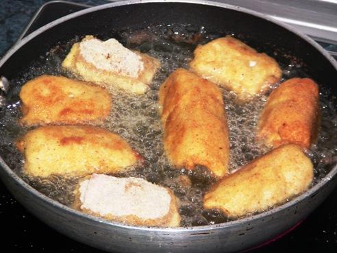 Ponemos una sartén con abundante aceite para que se vaya calentando, tenemos que freírlo a fuego medio para que se pase bien toda la carne hasta el interior, que fría pero que no queme el pan.