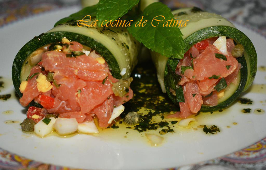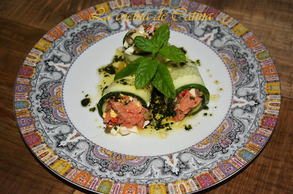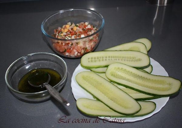 Colocamos una cucharada de la mezcla sobre una lámina de pepino y enrollamos ésta. Repetimos el proceso hasta terminar con toda la mezcla.