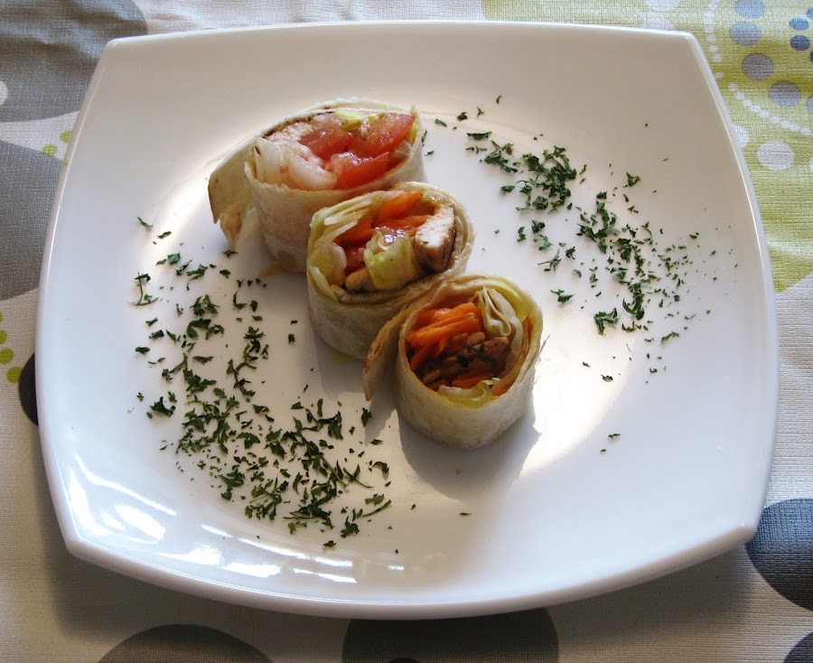 - Estira cada fajita y coloca en el centro las verduras y el pollo cortado en tiras.