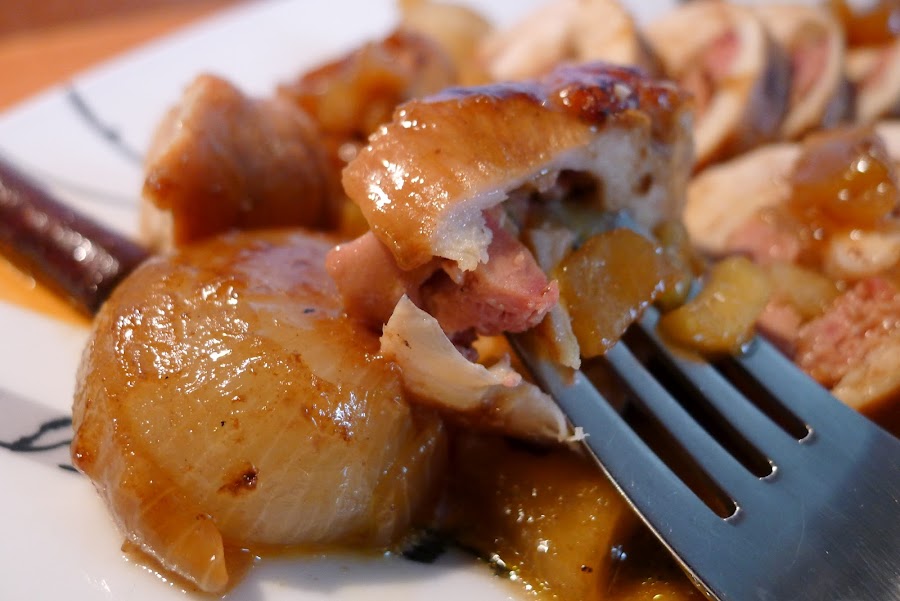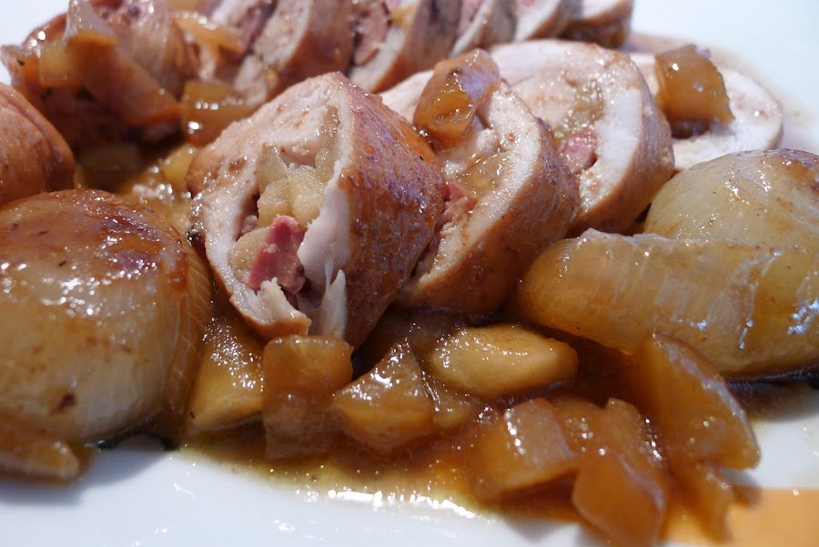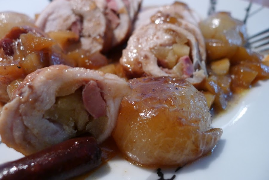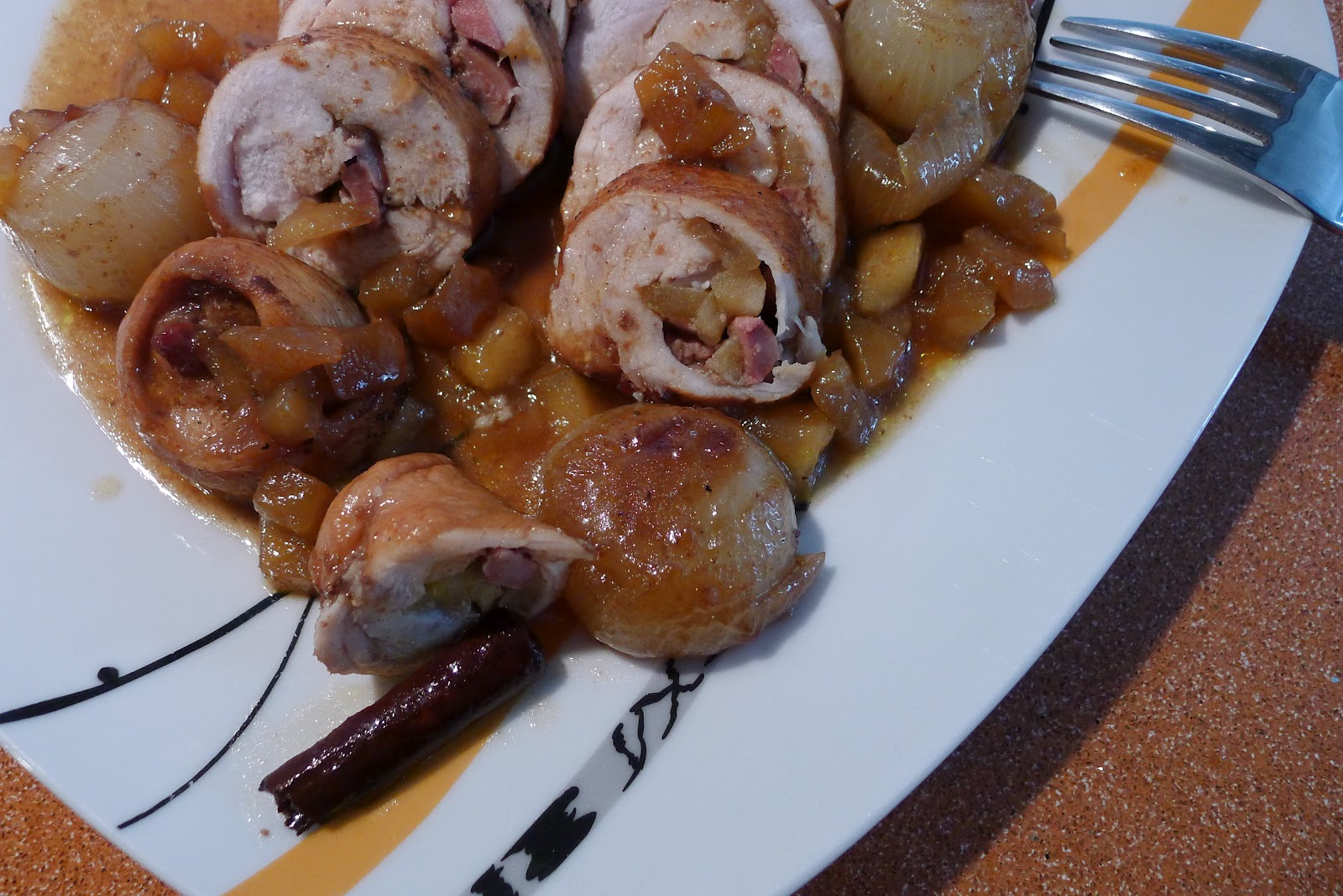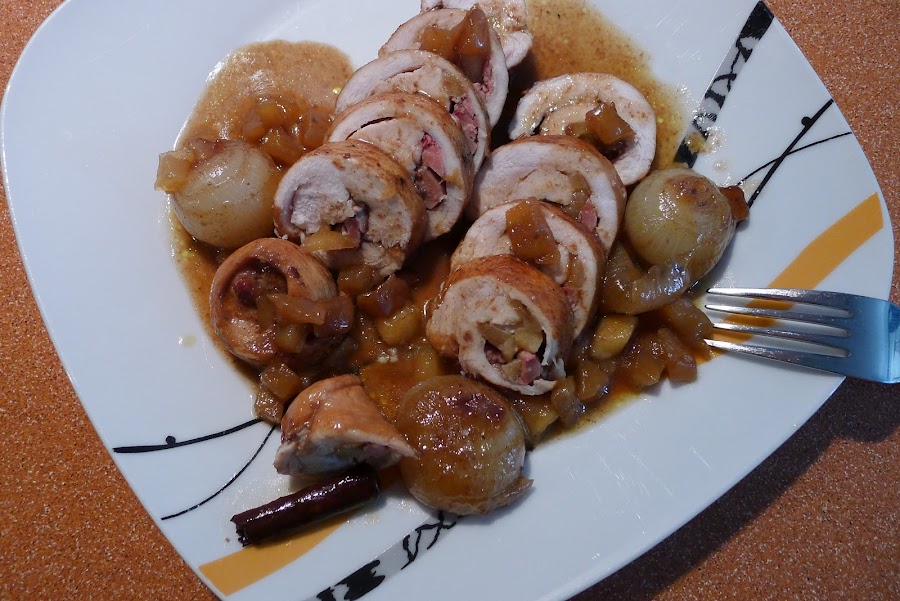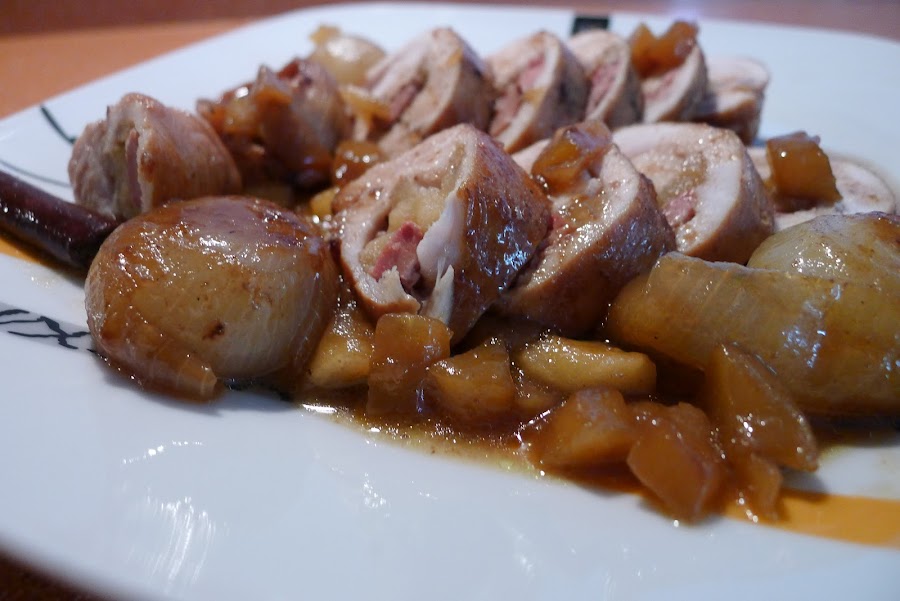 Por ultimo preparamos la salsa.Pelamos las cebollitas y enteras las pochamos en esa misma sarten,de manera que cojan color pero con cuidado que no se quemen,añadimos los rollitos,agua,un chorrito de leche,la reduccion de PX y la misma canela con la que antes caramelizamos las manzanas.Dejamos hacer como unos 20 minutos.A mitad de coccion,añadiremos a la salsa, la manzana que nos haya sobrado y salaremos con el avecrem o sal.Una vez hechos,apartar y en el momento de servir,retirar los palillos y cortarlo en rodajitas cubriendo con la salsa.Espero que os guste!