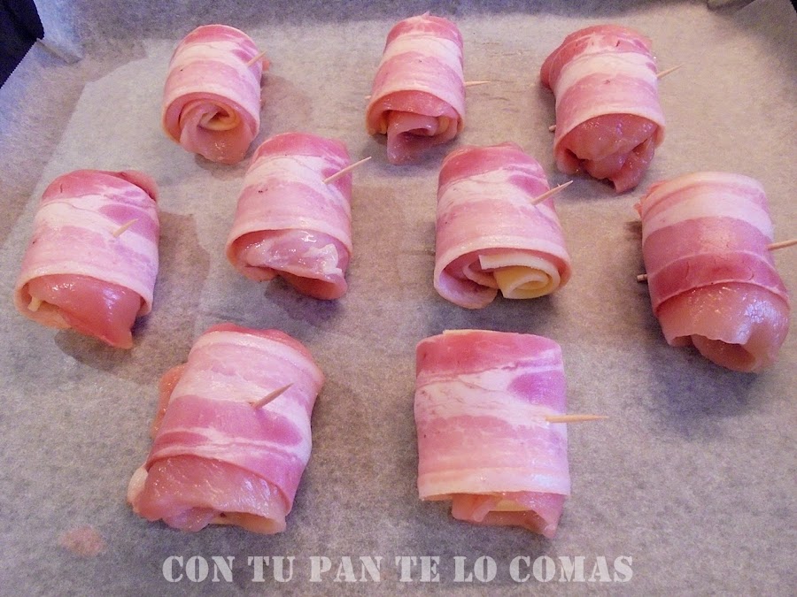 6. Los metemos en el horno hasta que el bacon esté dorado y crujiente, y como los filetes de pollo son muy finos se harán al mismo tiempo.