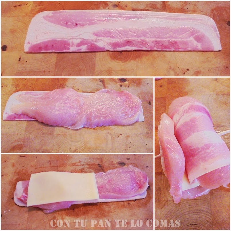 1. Extendemos la loncha de bacon y ponemos encima un filete de pollo finito. Sala ligeramente el pollo porque el bacon ya sabes que tiene bastante sal.